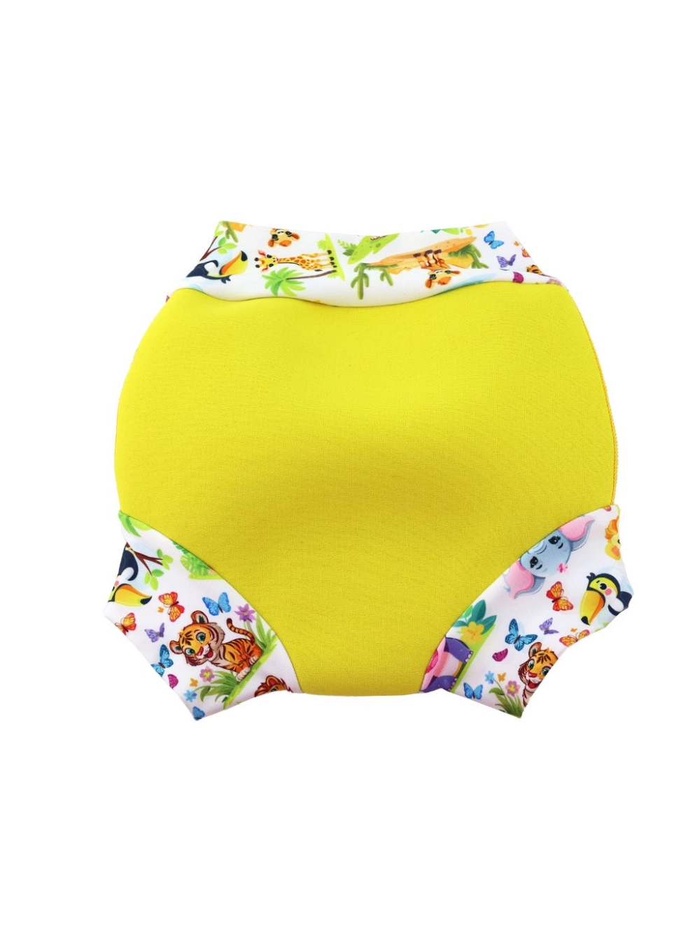 Colorful water adventures await! This reusable swim diaper is a great choice for kids who love colorful and cheerful patterns. The bright yellow neoprene fabric gives it an energetic character, and the adorable jungle animals, such as lions, tigers, giraffes, toucans and butterflies, will delight every little explorer.