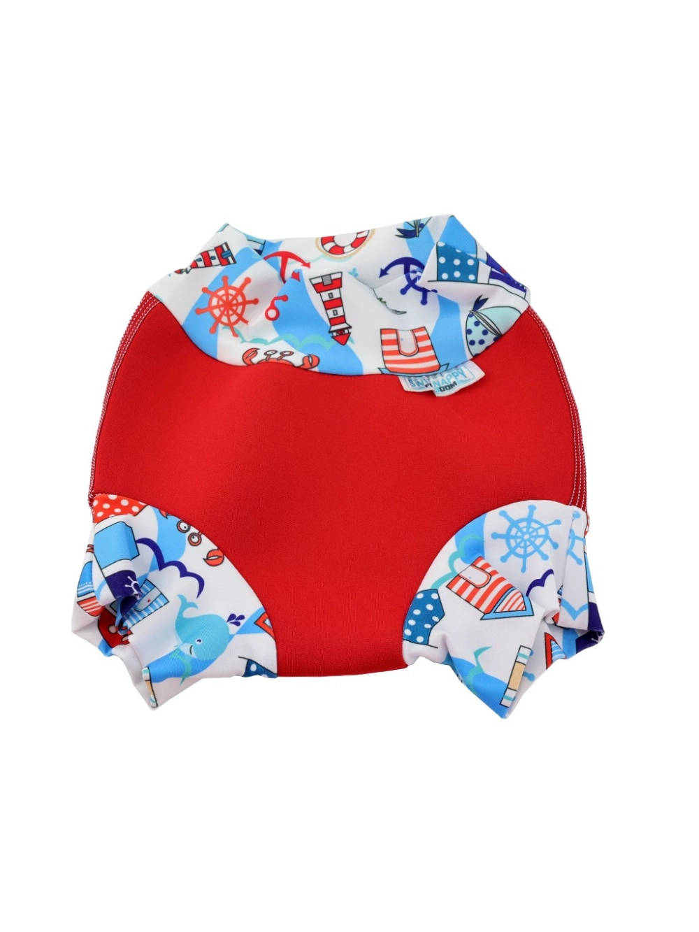 Cufundă-te într-o aventură pe mare cu un scutec de înot unic! Acest model reutilizabil într-o culoare roșu intens, decorat cu modele nautice fermecătoare – ancore, faruri și animale marine – este alegerea perfectă pentru piscină, plajă și primele aventuri în apă ale bebelușului tău.
