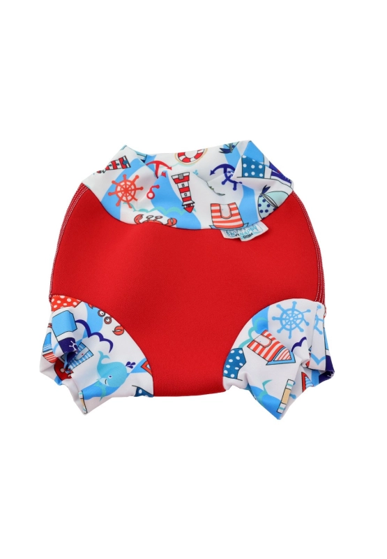Підгузок має насичений червоний колір у поєднанні з біло-блакитними морськими мотивами. Казкові ілюстрації маяків, якорів і морських тварин роблять будь-які водні розваги ще більш особливими.