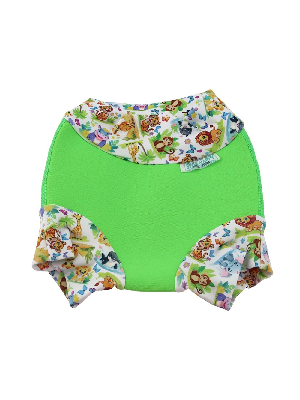 Завдяки поєднанню неоново-зеленого кольору з милими тропічними тваринами підгузник не тільки виконує свої захисні функції, але й виділяється своїм унікальним, дитячим дизайном. Ідеально підходить для басейну, для навчання плаванню та для святкового купання в морі чи озері.
